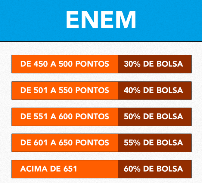 Também é possível garantir o ingresso com a sua nota do Enem e ainda garantir um desconto de até 60% na mensalidade. Neste caso, não é necessário fazer provas, basta ter, no mínimo, 450 pontos no Enem e não ter zerado a redação.