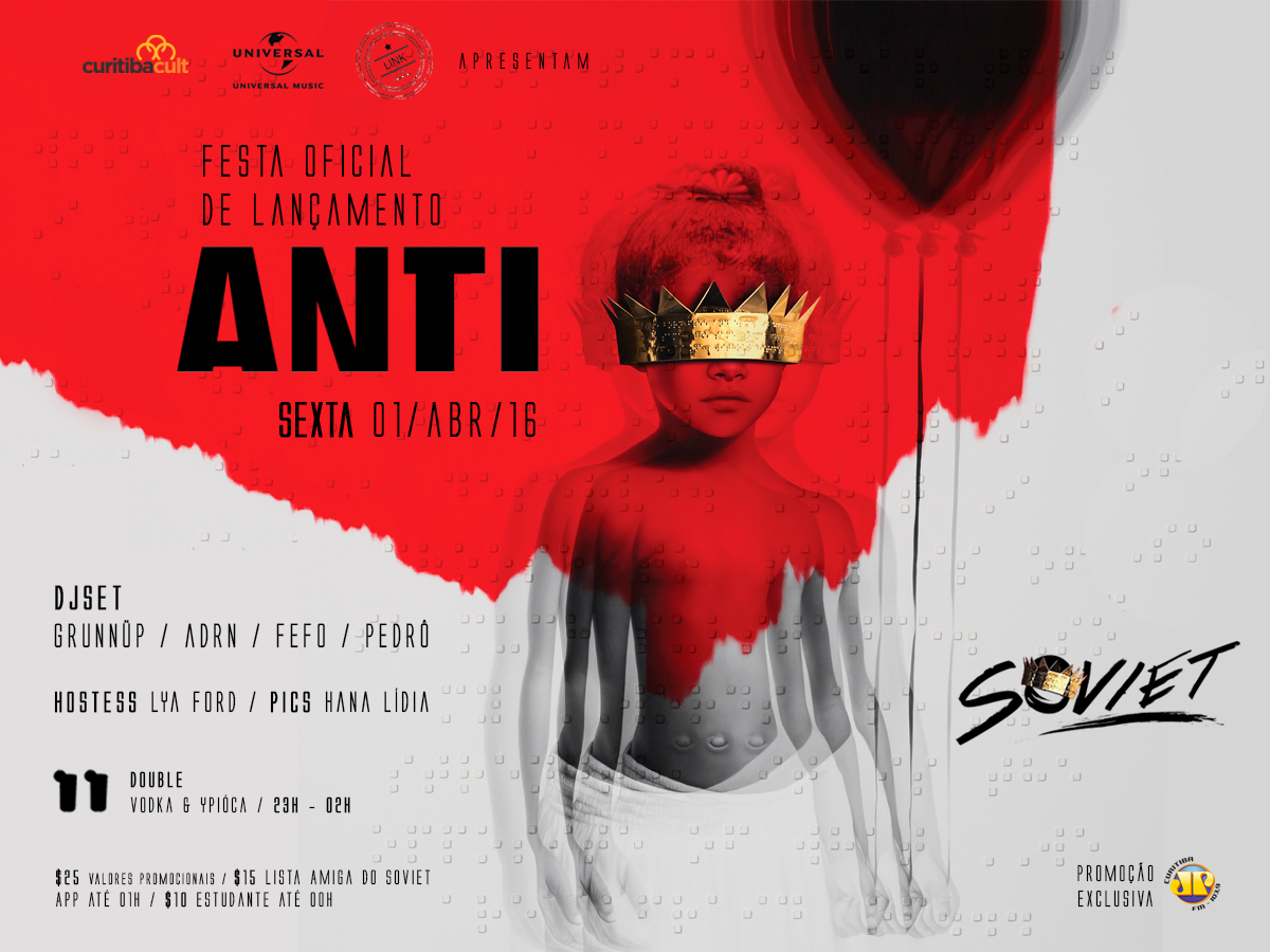 Mais uma vez o Curitiba Cult se junta ao Soviet para promover a “Festa Oficial ANTI”, que reunirá os melhores sucessos do novo CD de Rihanna e claro, os grandes sucessos da cantora. O evento acontecerá nesta sexta (1º), às 23h e o valor de entrada estará a partir de R$10.