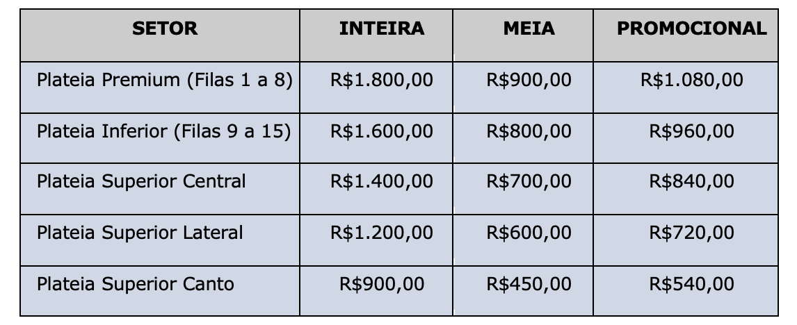 Quanto: os ingressos variam de R$ 540 a R$ 1.800,00 de acordo com o setor e modalidade escolhidos