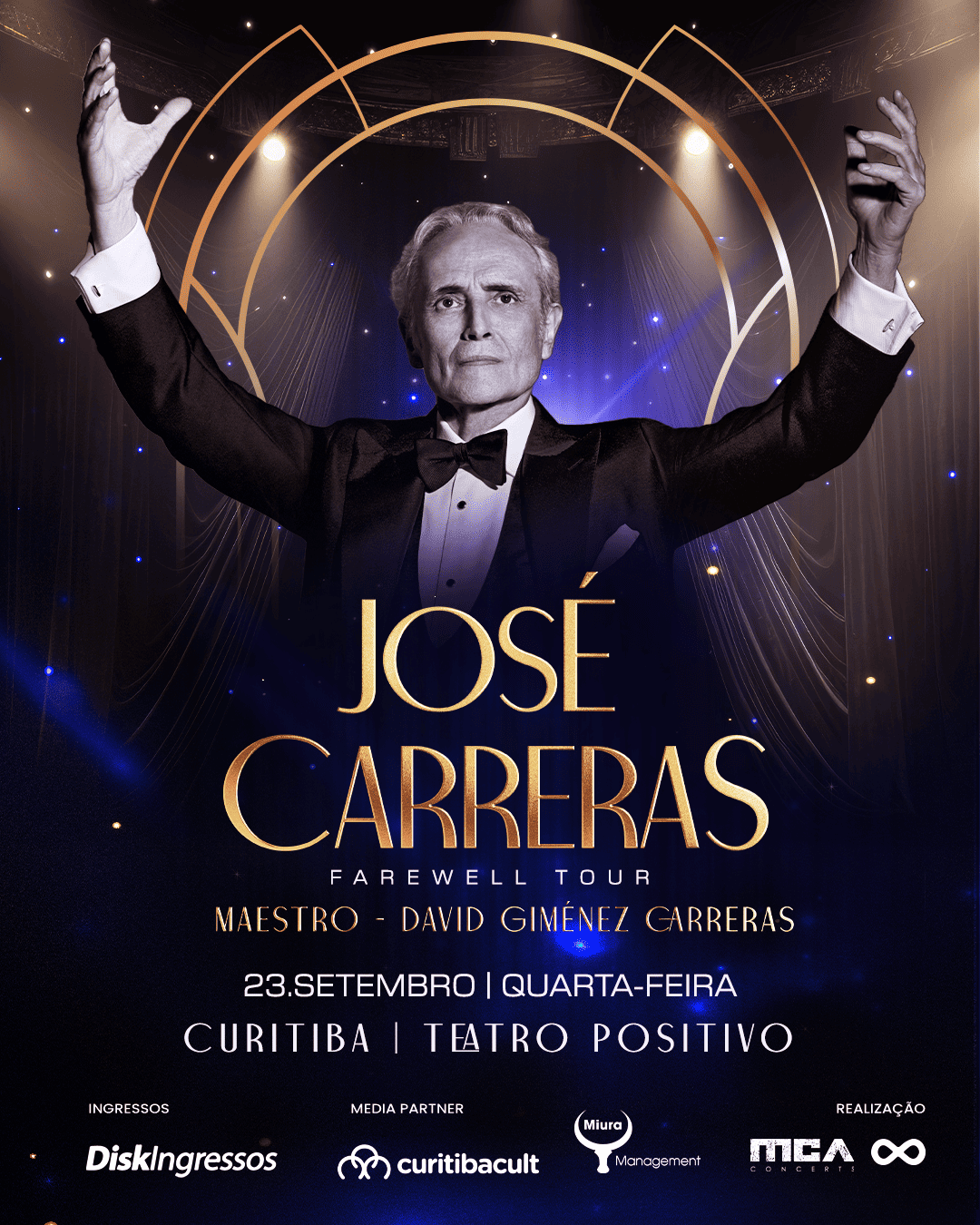 O lendário tenor espanhol José Carreras traz sua turnê mundial de despedida ao Brasil, a Farewell Tour, e anuncia três shows pelo país com a regência de David Giménez. Curitiba recebe a primeira apresentação da turnê no dia 23 de setembro, no Teatro Positivo. A apresentação na capital paranaense tem o Curitiba Cult como media partner.