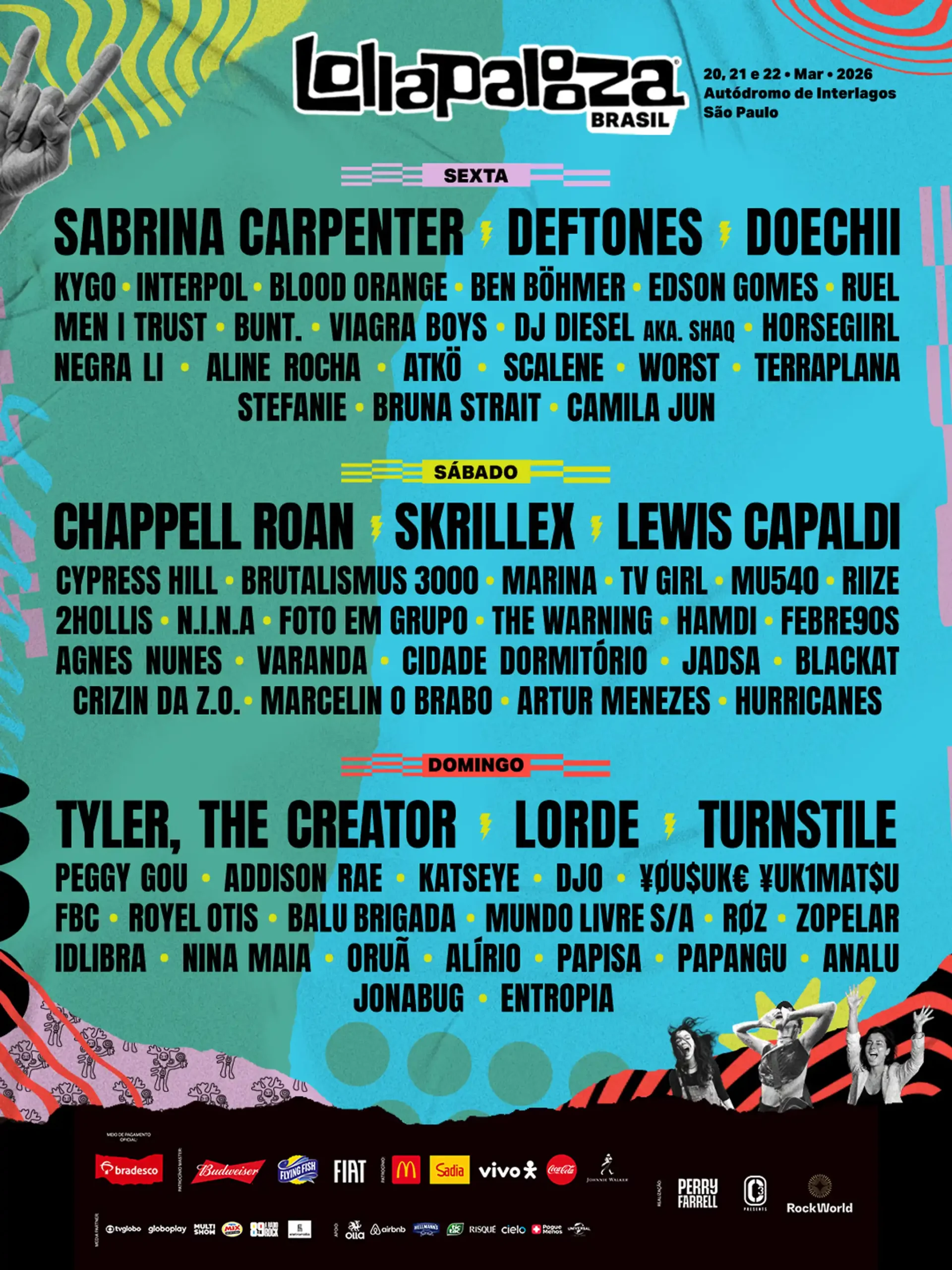 Entre os destaques do line-up estão Sabrina Carpenter, Deftones e Doechii na sexta-feira; Chappell Roan, Skrillex e Lewis Capaldi no sábado; e Lorde, Tyler, The Creator e Addison Rae no domingo, garantindo uma programação diversa que passa pelo pop, rock alternativo, eletrônico e hip-hop.